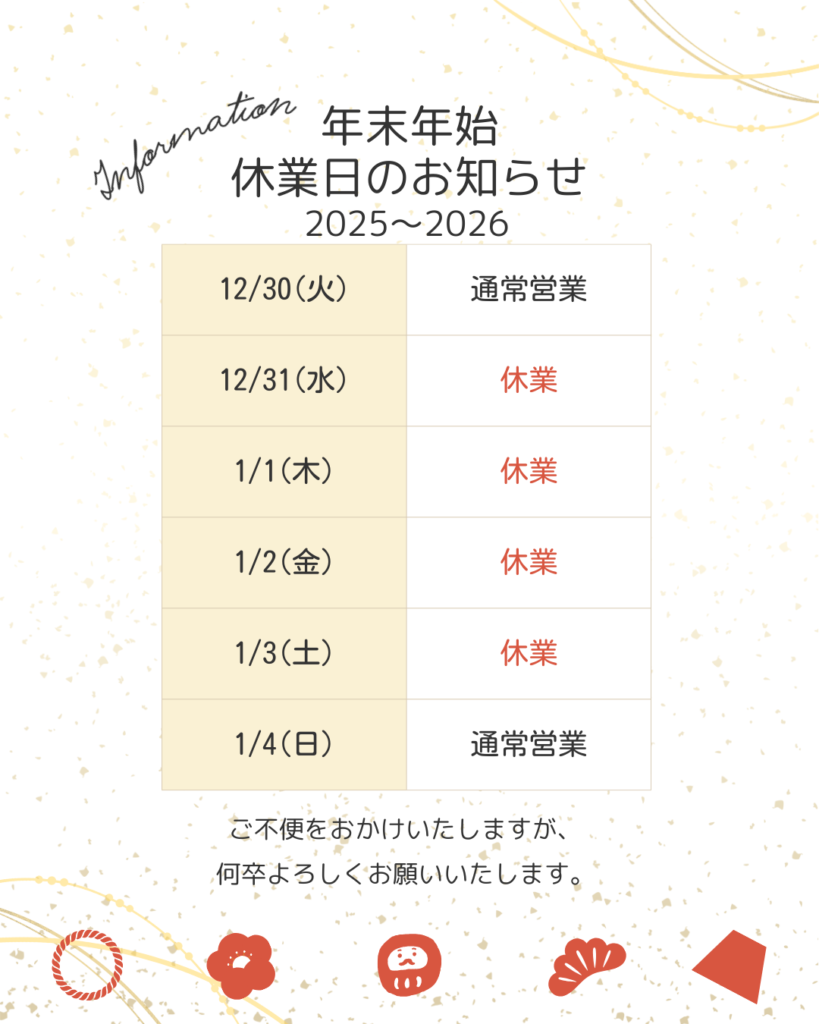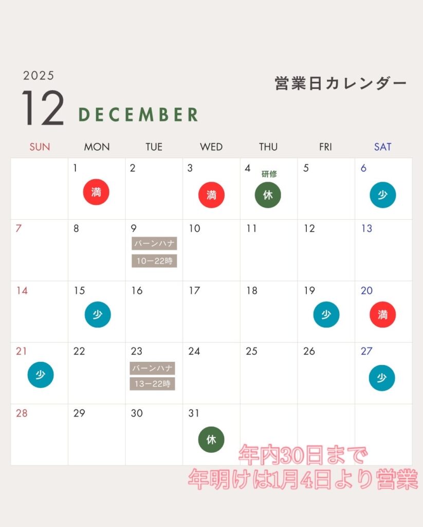 NEW 12月営業案内(^^)(2025年12月5日) 早いもので今年も後一ヵ月‼️あっという間の一年でした😳 今年の疲れは今年のうちに✨皆さまのたくさんのご来店をお待ちしております♡ 年内は30日まで通常営業年明けは4日より営業致します🈺👩💼 皆さまのお越しを心よりお待ちしております✨
